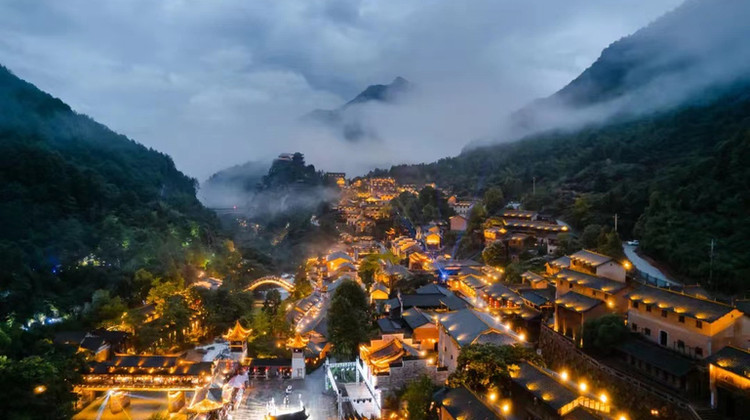 夜幕低垂,华灯初上,浪漫的气息笼罩着整个山谷,隐世悬崖之上的灯火阑珊,山林溪水相伴,享受仙谷夜色。